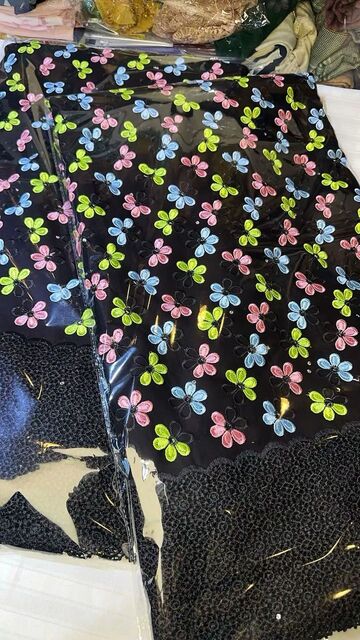 Les Motifs : Le tissu est parsemé de petites fleurs (ou papillons) brodées dans un trio de couleurs pastel et acidulées :